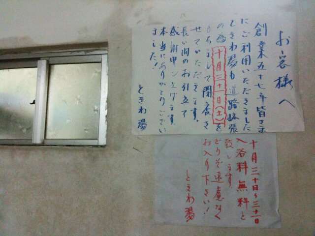 概要 ときわ湯は糸満市糸満にあった銭湯。タクシー会社も経営しており、お湯を沸かす燃料には廃油も利用していたそうです。道路拡張のため、57年間の歴史に幕を下ろしました。閉店前の2日間は入浴無料だったそうです。 link 【ゆーふるやー探訪記】ときわ湯(2010.10.06)