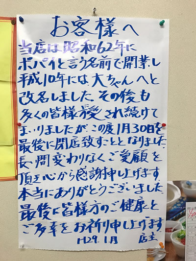 Big大ちゃんの創業は1987年年5月。沖縄市胡屋の豊年満作通りに店を構えていた当時は、中華ラーメンポパイという屋号で営業を開始したそうです。1998年年、アメリカの同名のレストランチェーンから弁理士を通じて商標法違反を訴えられ「Big大ちゃん」に改名。その後も地域住民からも観光客からもそして沖縄で生活した多くの外国人からも愛されたお店でした。