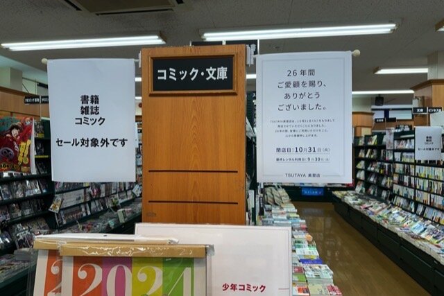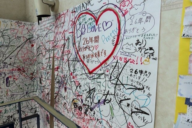 TSUTAYA美里店は26年続いたTSUTAYA店舗でした。閉店間際にお店の展示棚などがガレージセールで売られており、店舗へのメッセージ付箋も沢山貼られていました。