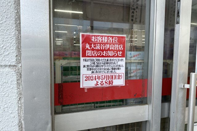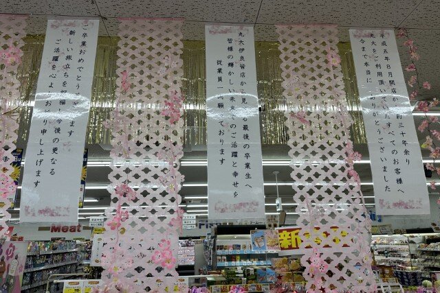 沖縄のローカルスーパー、丸大の伊良皆店。2024年5月10日をもって閉店しました。卒業シーズンには卒業生に向けたポップも飾られており、地元に根付いた店舗でした。
